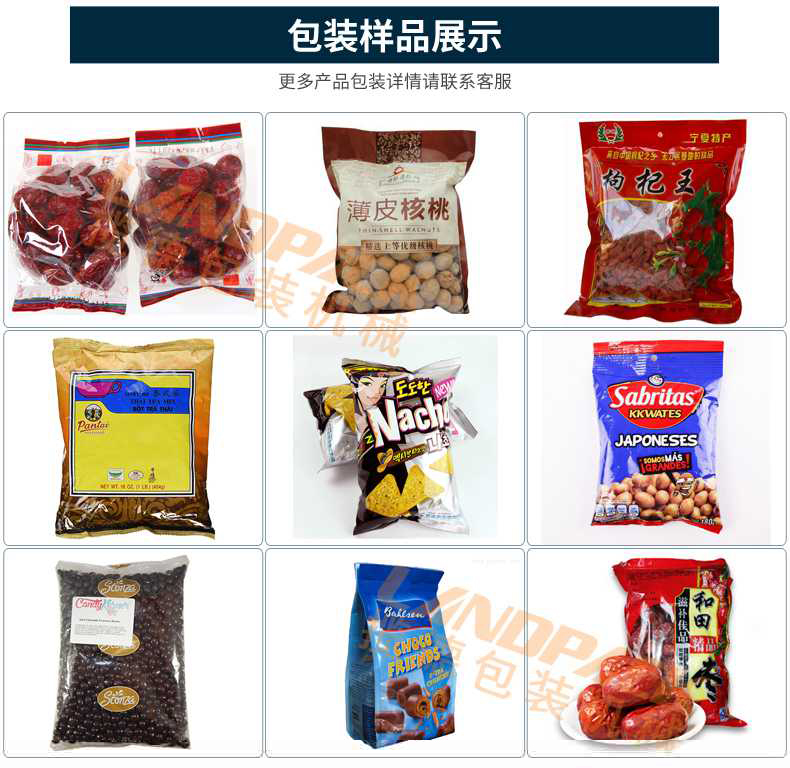 包裝范圍:顆粒、膨化食品、條狀、球狀、塊狀、片狀物料