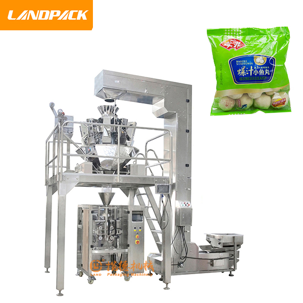速凍魚丸包裝機(jī)由Z型自動上料機(jī)、10頭電子稱、工作支撐平臺、420立式包裝機(jī)主機(jī)、成品輸送機(jī)五大部分組成。該機(jī)的工作流程是:操作者將需要包裝的速凍肉丸、魚丸倒入Z型上料機(jī)的震動料斗當(dāng)中,震動料斗通過電機(jī)的震動,把丸子輸送到上料機(jī)托盤當(dāng)中,然后經(jīng)過傳送帶輸送到10頭稱里面進(jìn)行稱重,10個(gè)電子稱的料斗進(jìn)行組合稱重,一旦重量達(dá)到設(shè)置的參數(shù),就會自動下料到袋子當(dāng)中進(jìn)行封口、打印生產(chǎn)日期、成品輸出等環(huán)節(jié)完成整個(gè)包裝過程。
